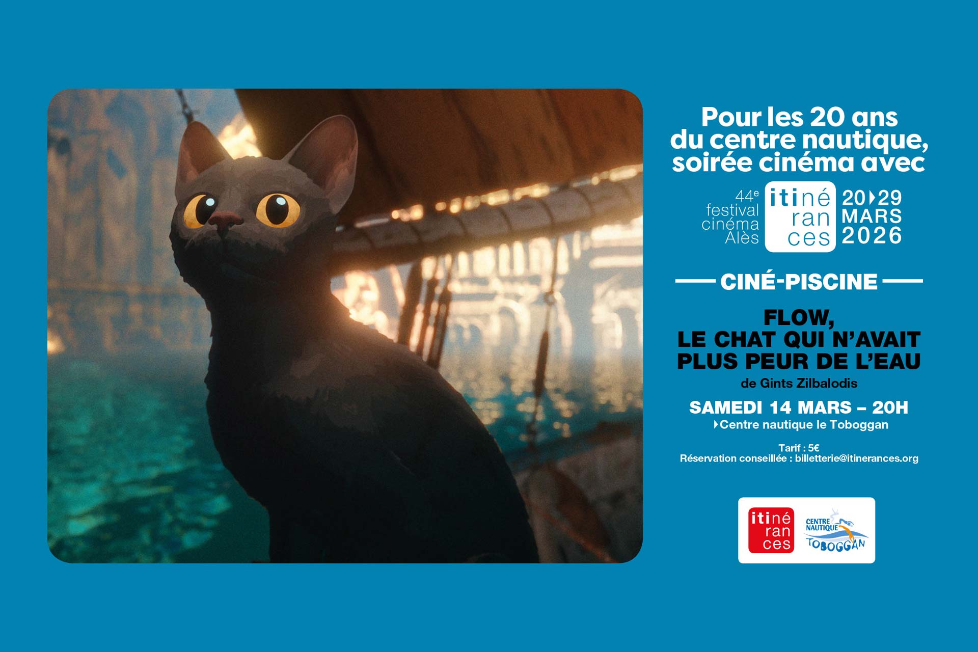 Horaires Cours TArifs Activités Scolaires Évènements Cinéma : "Flow, le chat qui n'avait plus peur de l'eau" Samedi 14 mars 2026 à 20hSoirée cinéma pour les 20 ans du centre nautique en partenariat avec le festival cinéma Itinérances. EcouterActiver la vocalisation Enregistrer au format PDF Plus d'informations AdresseCentre nautique Le toboggan,Quai de la brigade du Languedoc, 30100 AlèsTéléphone04 66 91 20 70